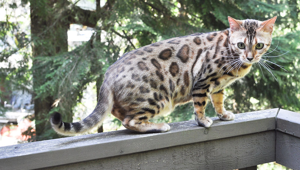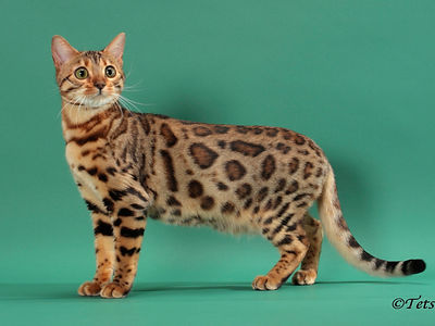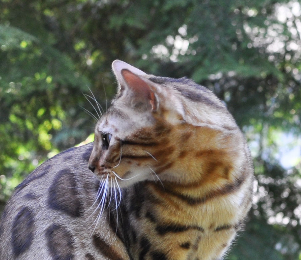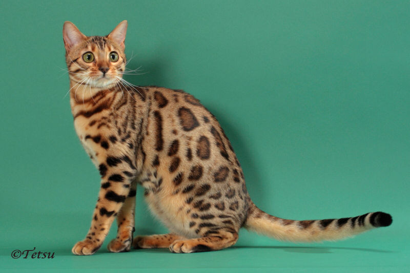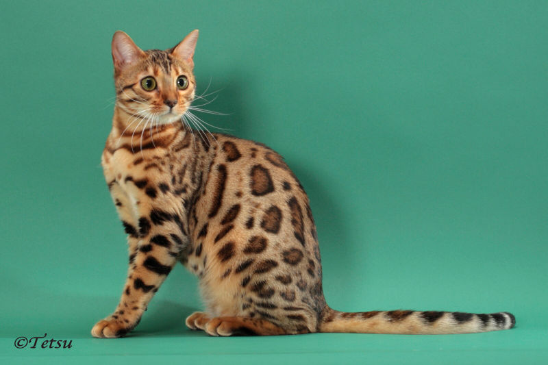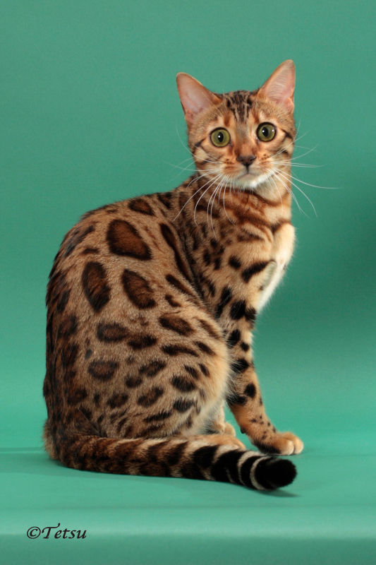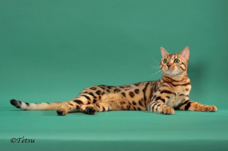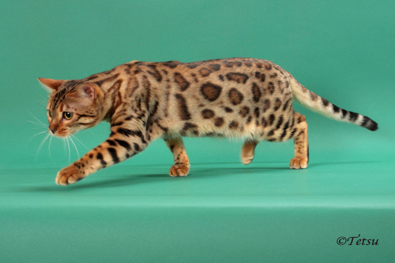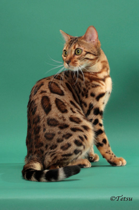 She also has "Type" - I feel she's one of the best "combinations" of Coat/Type that you'll see in a Bengal. One judge took Cybele out and commented "if I didn't see the pink card on top, I would have thought this was a boy!" She is strong and muscular. Her coat is the super tight pelt that comes from the ALC ancestor - Just beautiful and so soft to the touch.