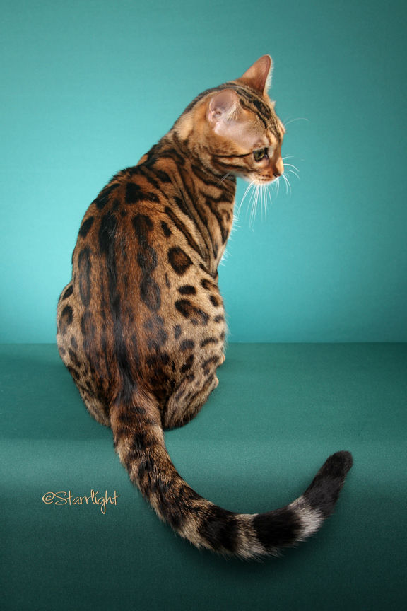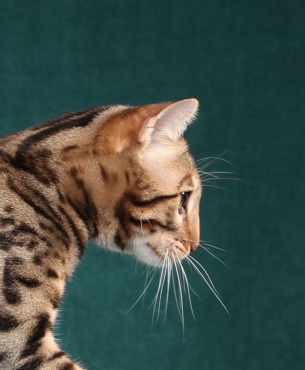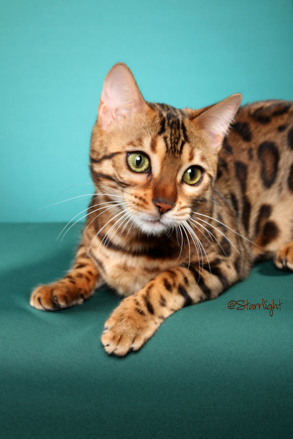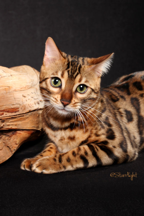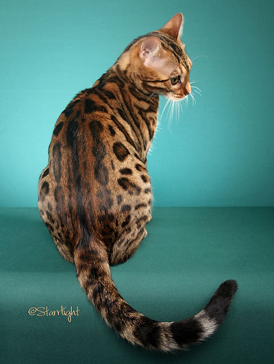 She has the sumptuous Svelte pelt that is high in contrast, rich in coloring and very very clear..... Her head is out-of-this-world!! She has huge eyes that are whited around the edges.... Nice whisker pads, Strong chin and a great head shape. For her size, she is the most muscular female here - She's small, but so incredibly strong. Truly the best combination of "Type" and "Pattern" that I've experienced in a bengal.