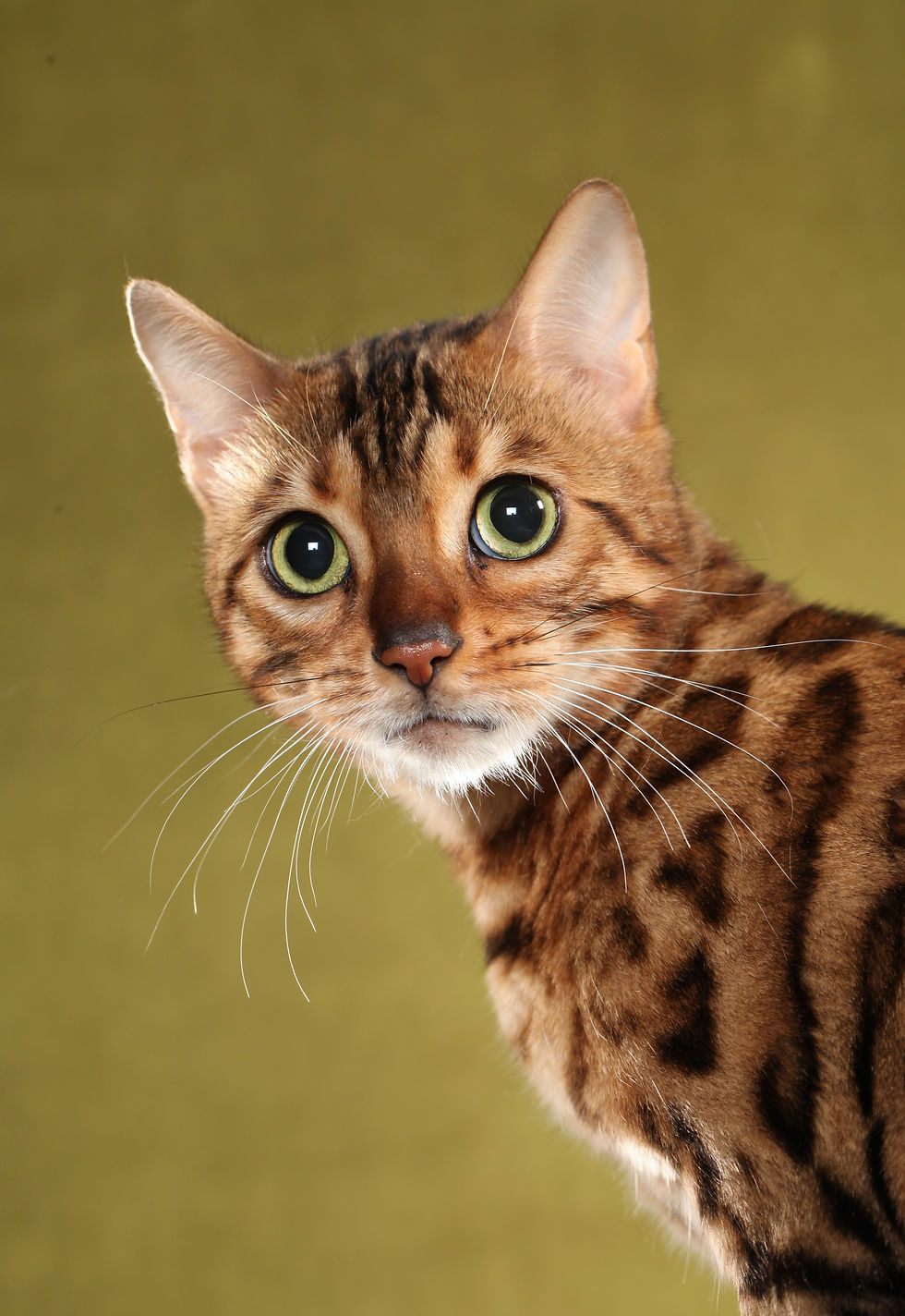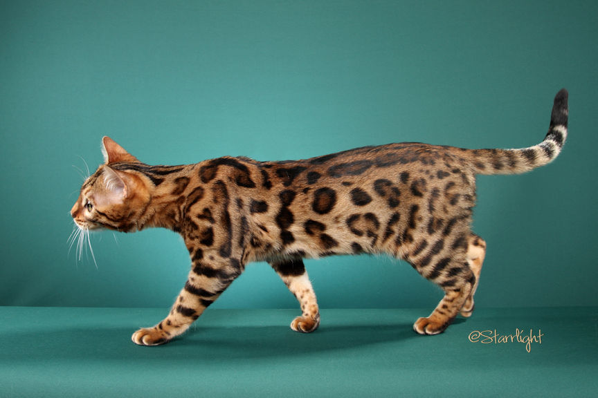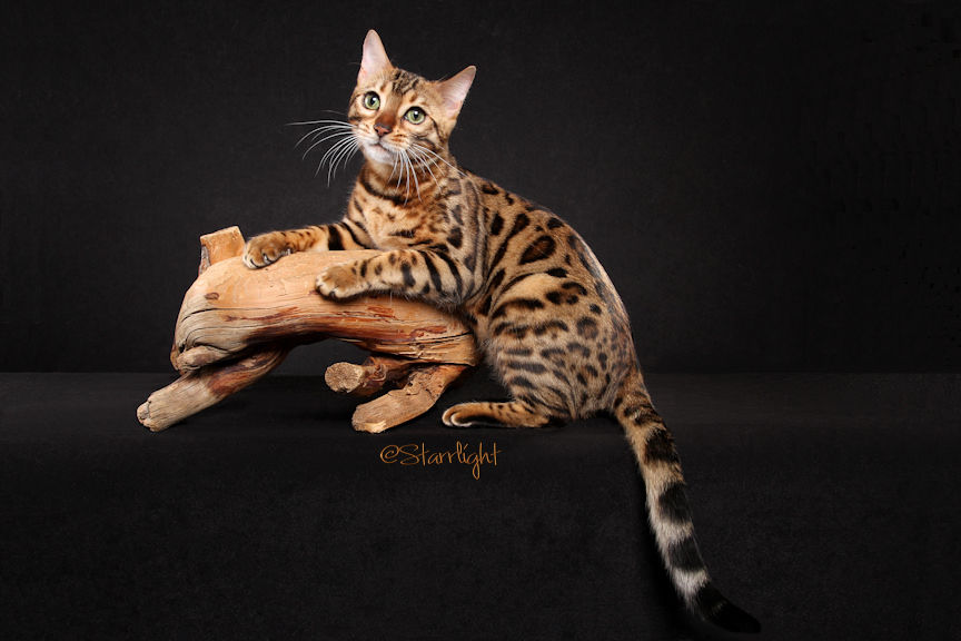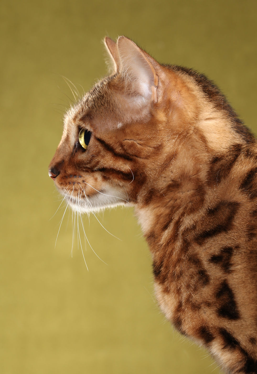 She has the sumptuous Svelte pelt that is high in contrast, rich in coloring and very very clear..... Her head is out-of-this-world!! She has huge eyes that are whited around the edges.... Nice whisker pads, Strong chin and a great head shape. For her size, she is the most muscular female here - She's small, but so incredibly strong. Truly the best combination of "Type" and "Pattern" that I've experienced in a bengal.